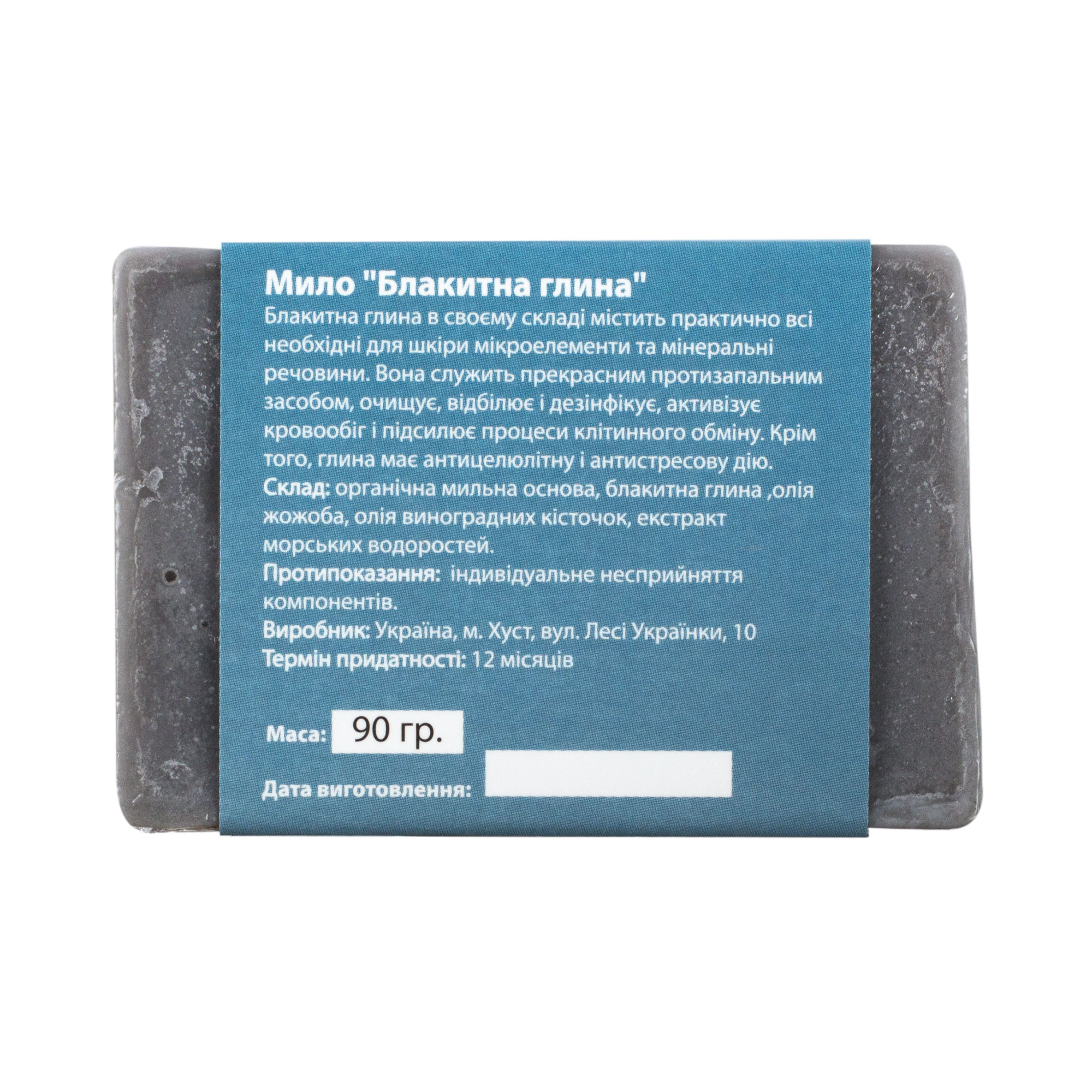 Склад: органічна мильна основа, блакитна глина,олія жожоба, олія виноградних кісточок, екстракт морських водоростей.