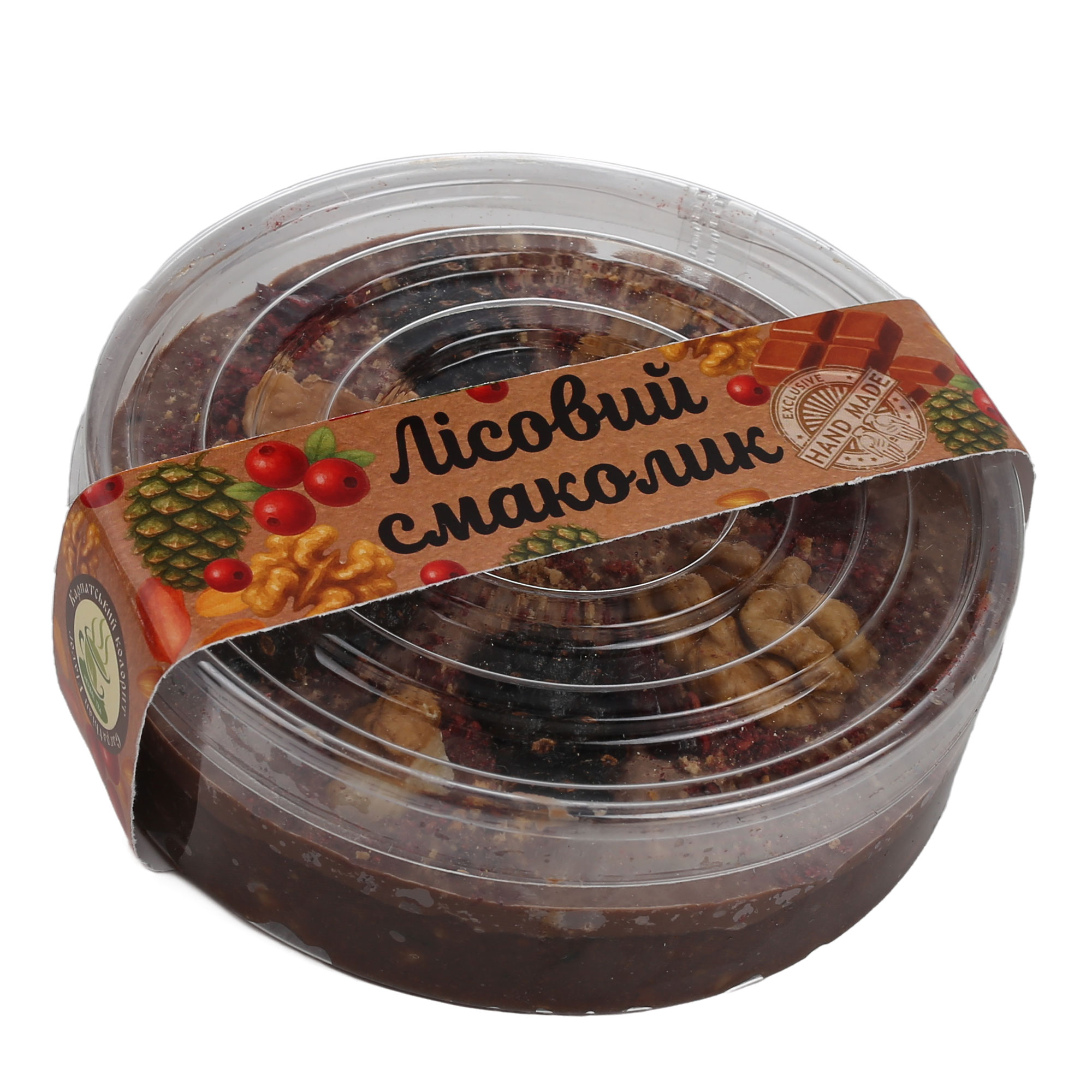 Чудове поєднання мелених горіхів, журавлини, цукатів з соснових шишок, крихт бисквіту, молочного шоколаду – це натуральний карпатський смаколик до запашних трав’яних чаїв.