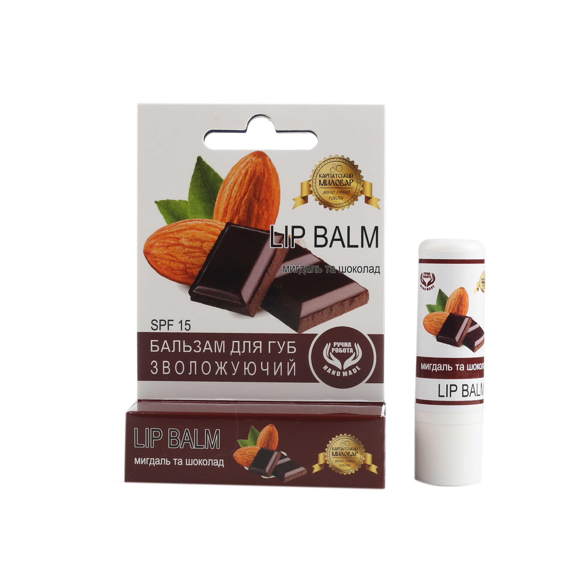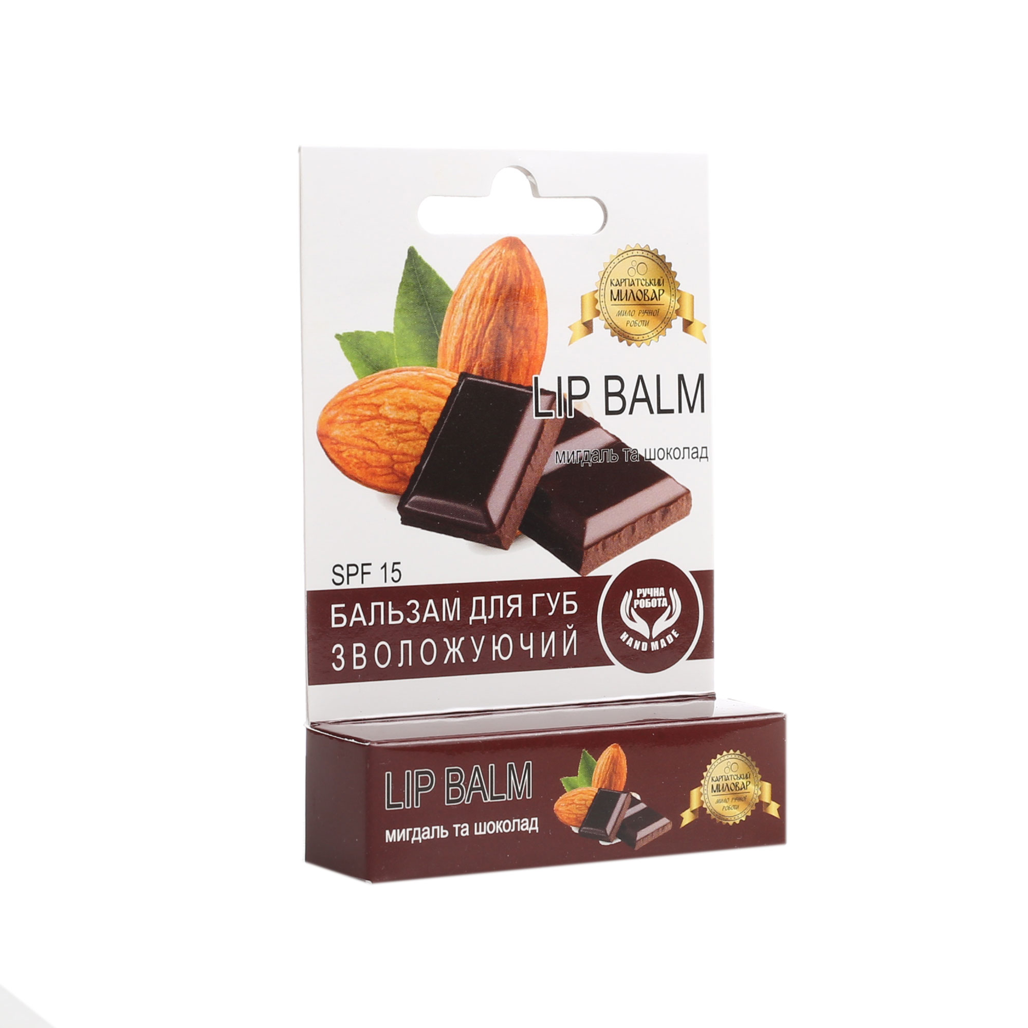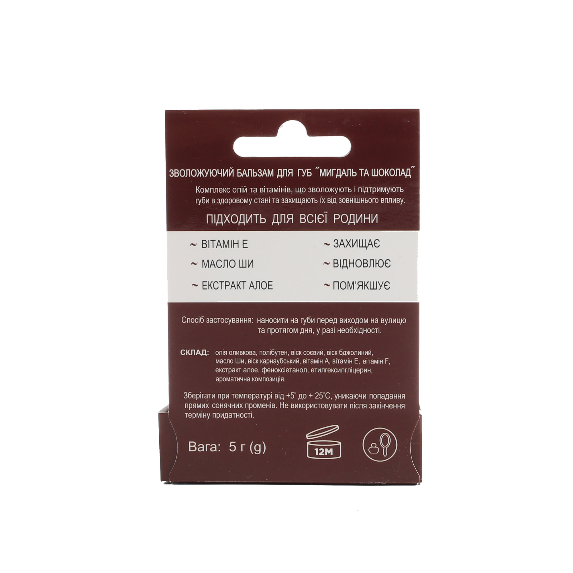 Склад: очищений бджолиний віск, соєвий віск, масло ШІ, вітамін А, вітамін Е, вітамін F, екстракт алоє, з ароматом шоколаду та мигдалю.