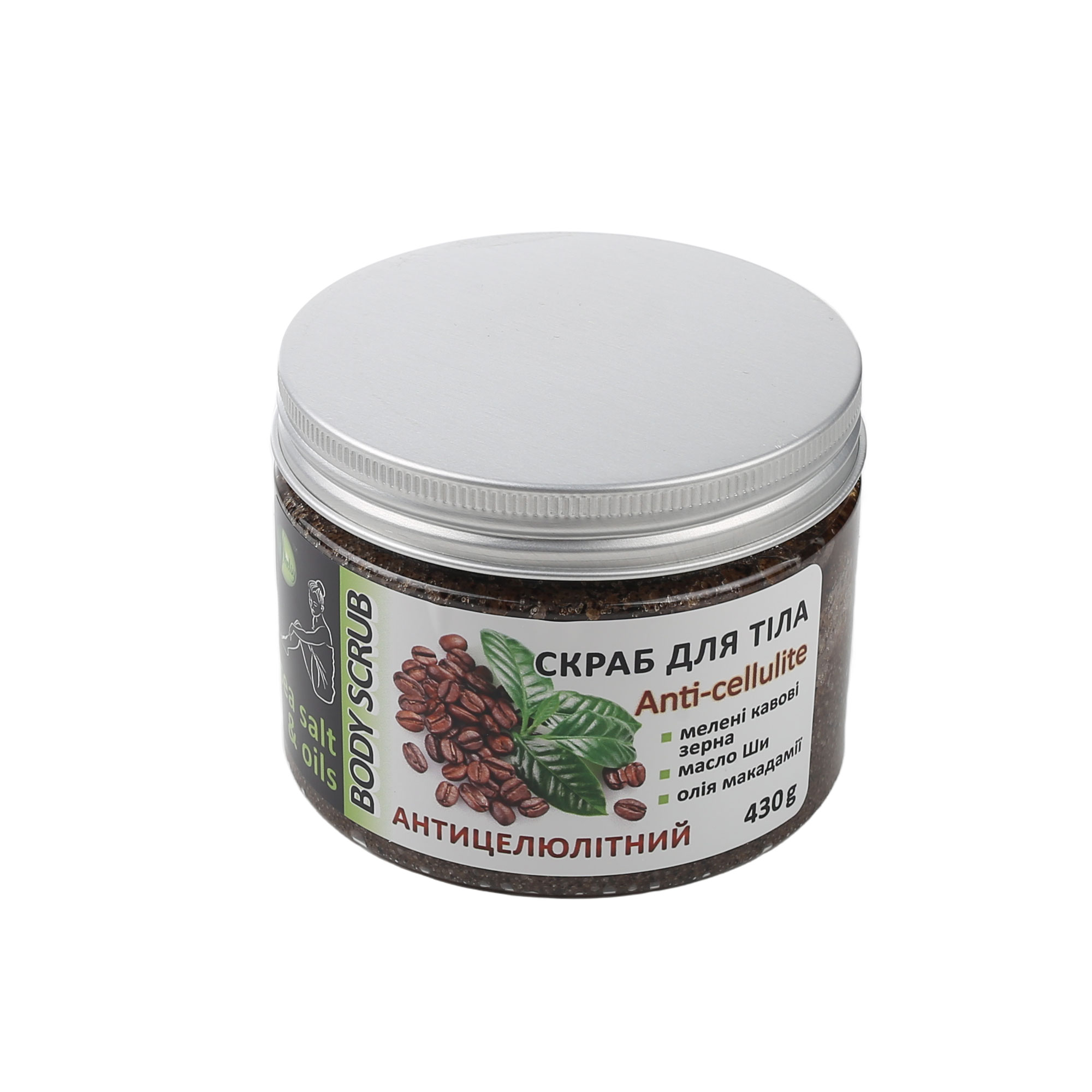 Скраб з меленими кавовими зернами ,олією ши та олією макадамії для тіла на основі морської солі і натуральних масел м’яко очищують і оновлюють шкіру, підсилюють циркуляцію крові, підтягують контури тіла.