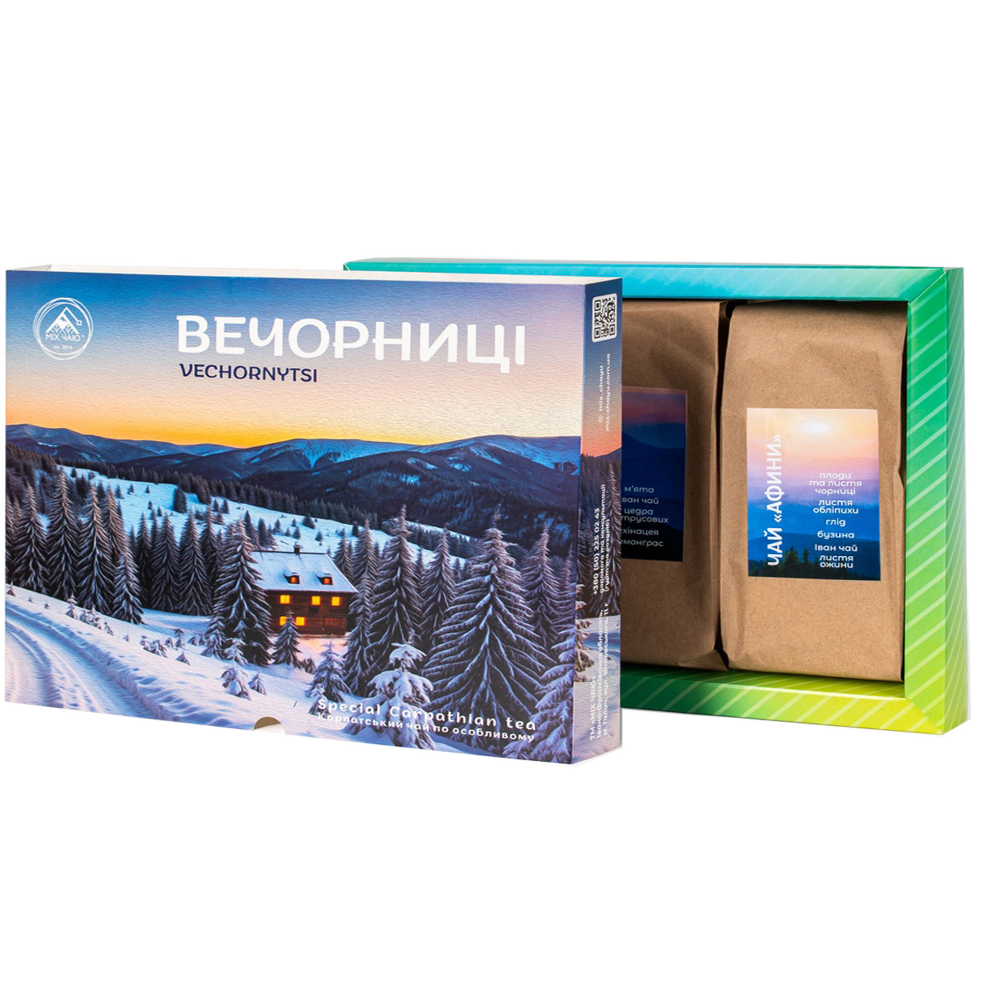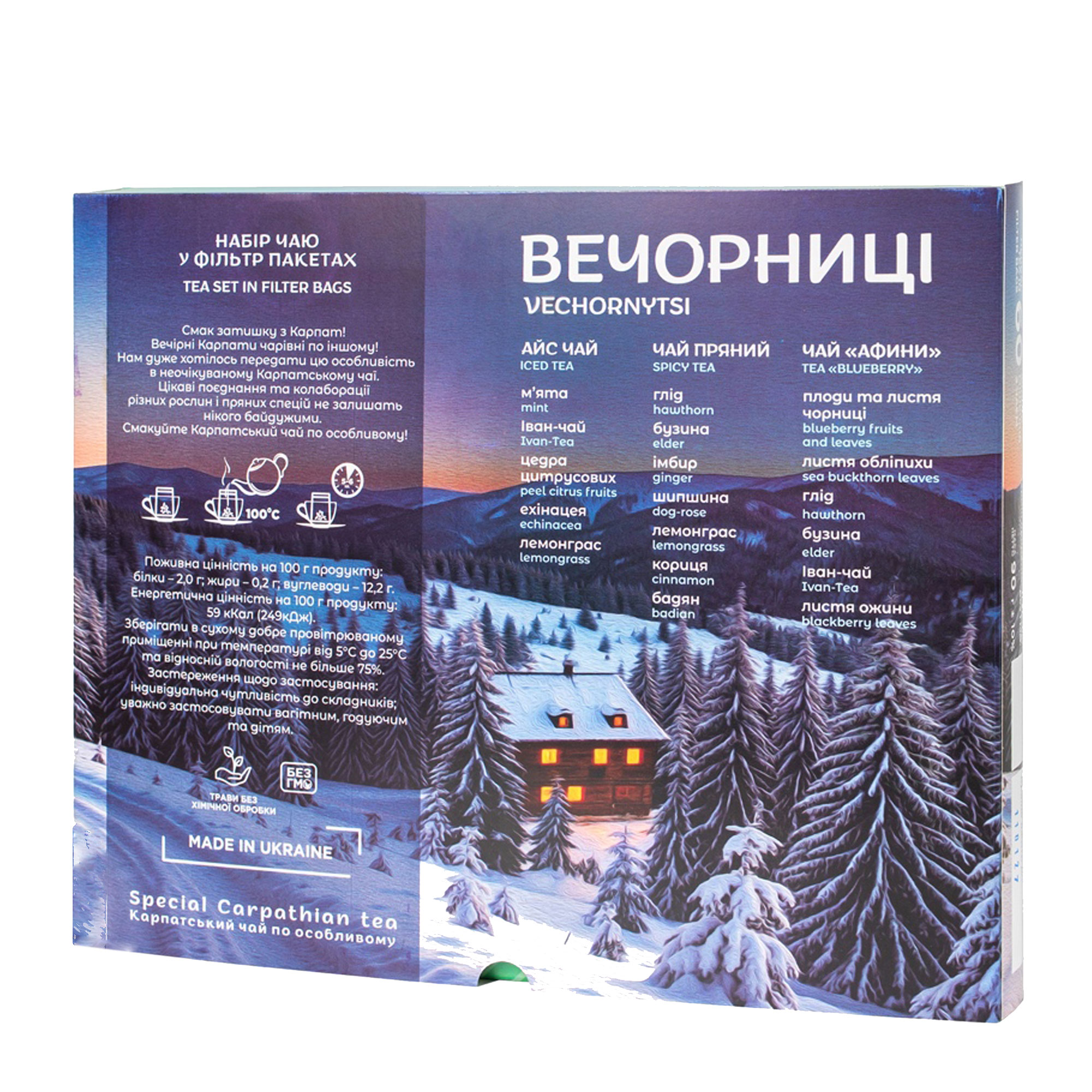 Ми пропонуємо Вашій увазі карпатський чай “Вечорниці”, який перенесе Вас у чарівні Карпати розкриваючи всю красу гір у таких чаях як “Афини”, “Айс чай” та “Пряний”. Ви зможете не тільки насолодитись чарівним ароматом і смаком, а також оздоровитись корисними властивостями трав і плодів, які в ходять в склад цих чаїв.