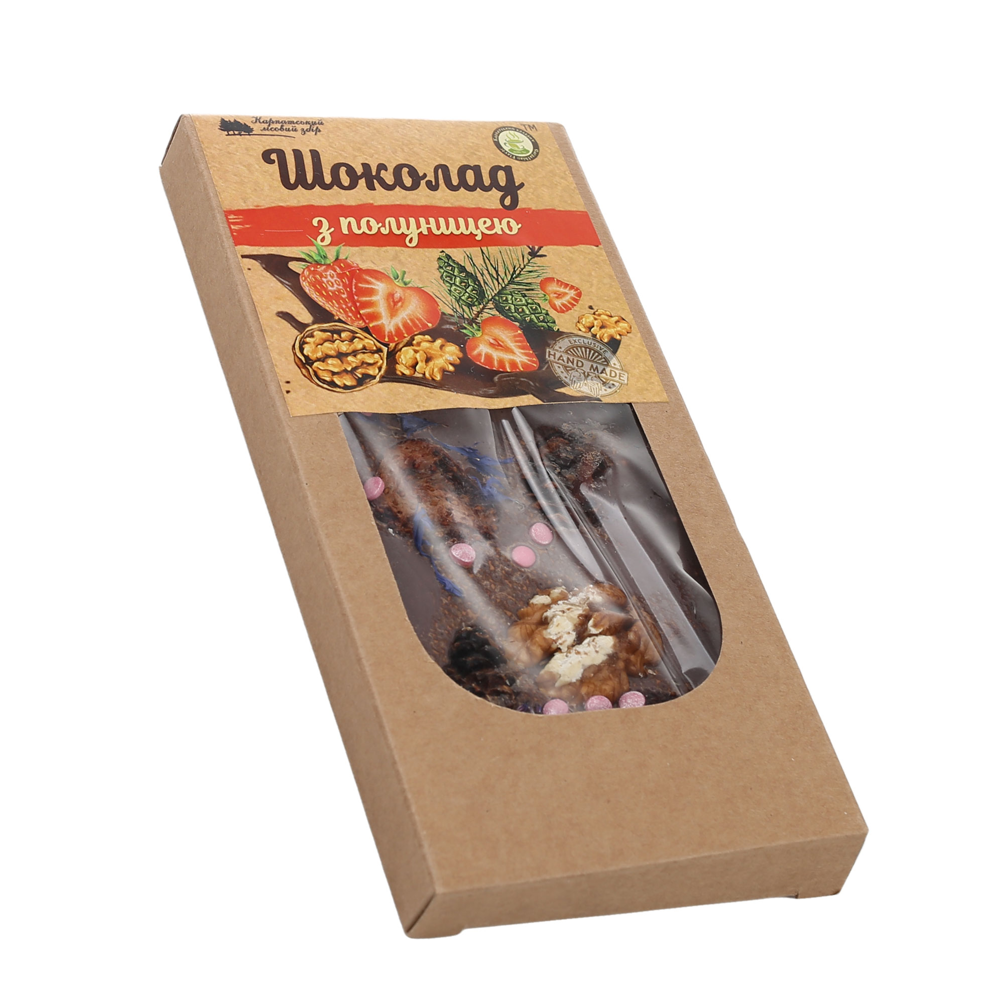 Склад: сублімована полуниця, ядро грецького горіха, шишки, харчовий декор, темно-молочний бельгійський шоколад 53% какао