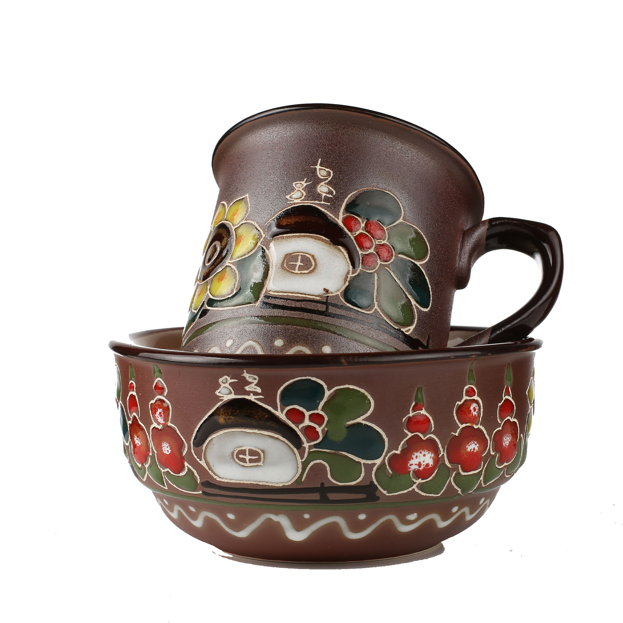 Чашка зроблена з екологічно чистих, натуральних матеріалів – білої глини, з покриттям харчової глазурі. Повністю ручна робота, від виготовлення до розпишу чашки.