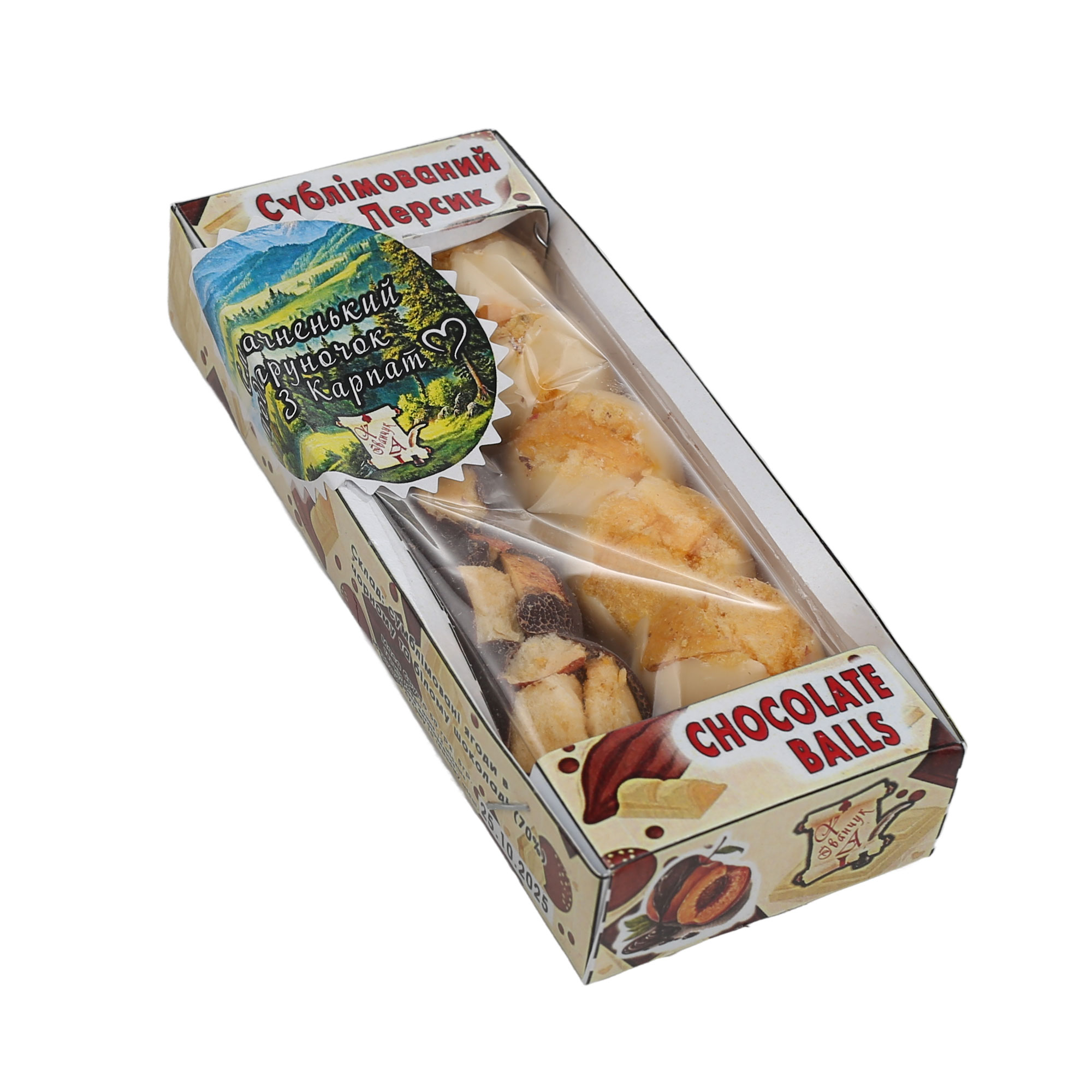 Сумблімований персик в чорному та білому шоколаді.