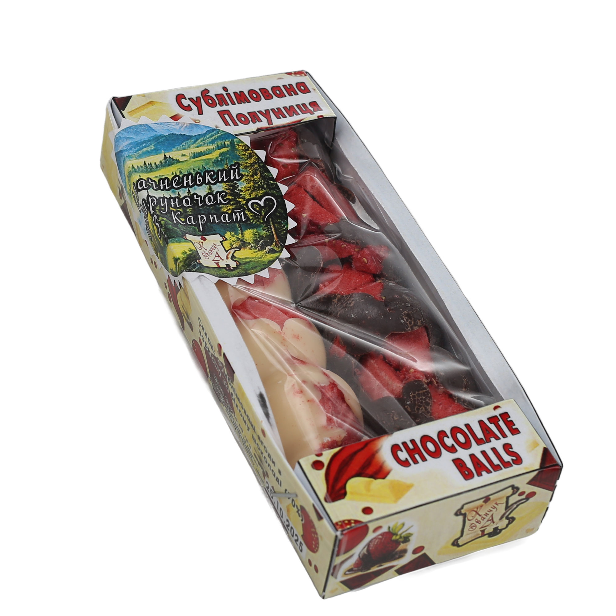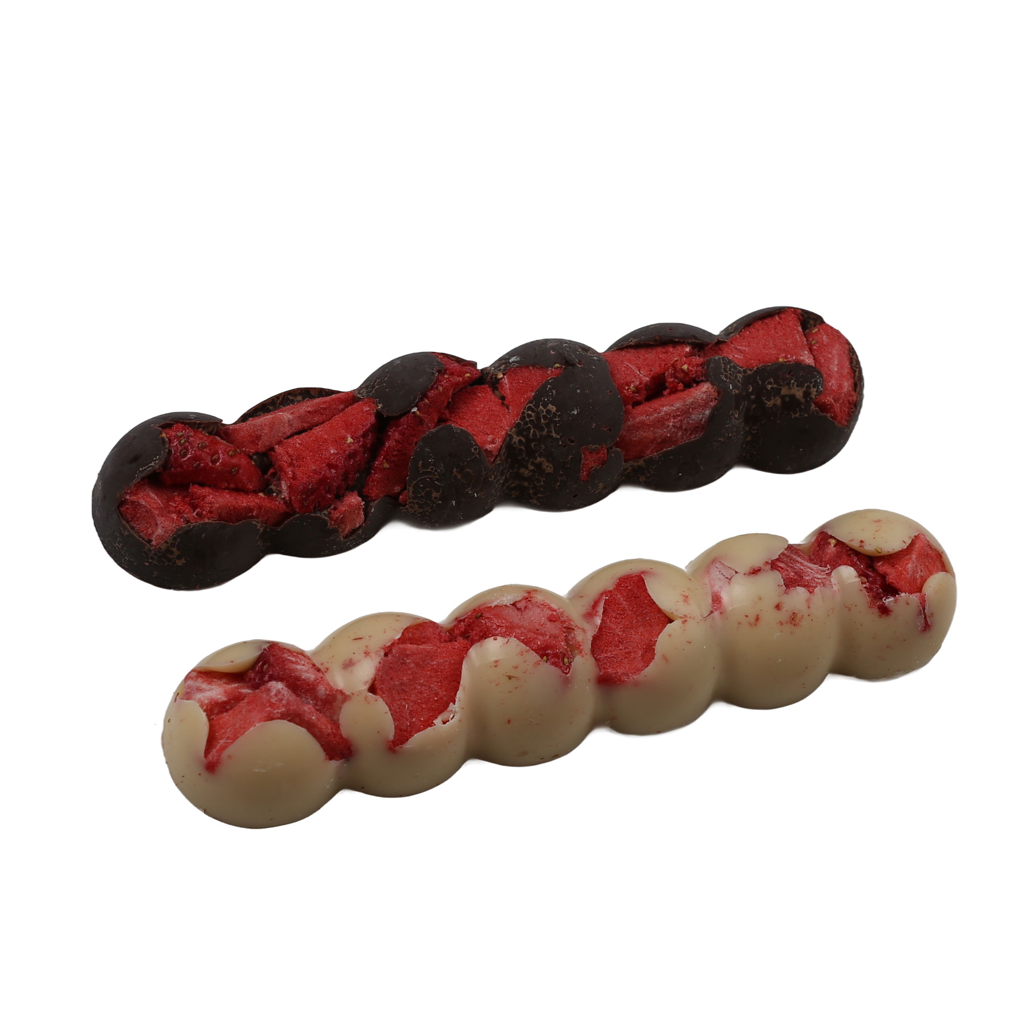 Сумблімована полуниця в чорному та білому шоколаді.