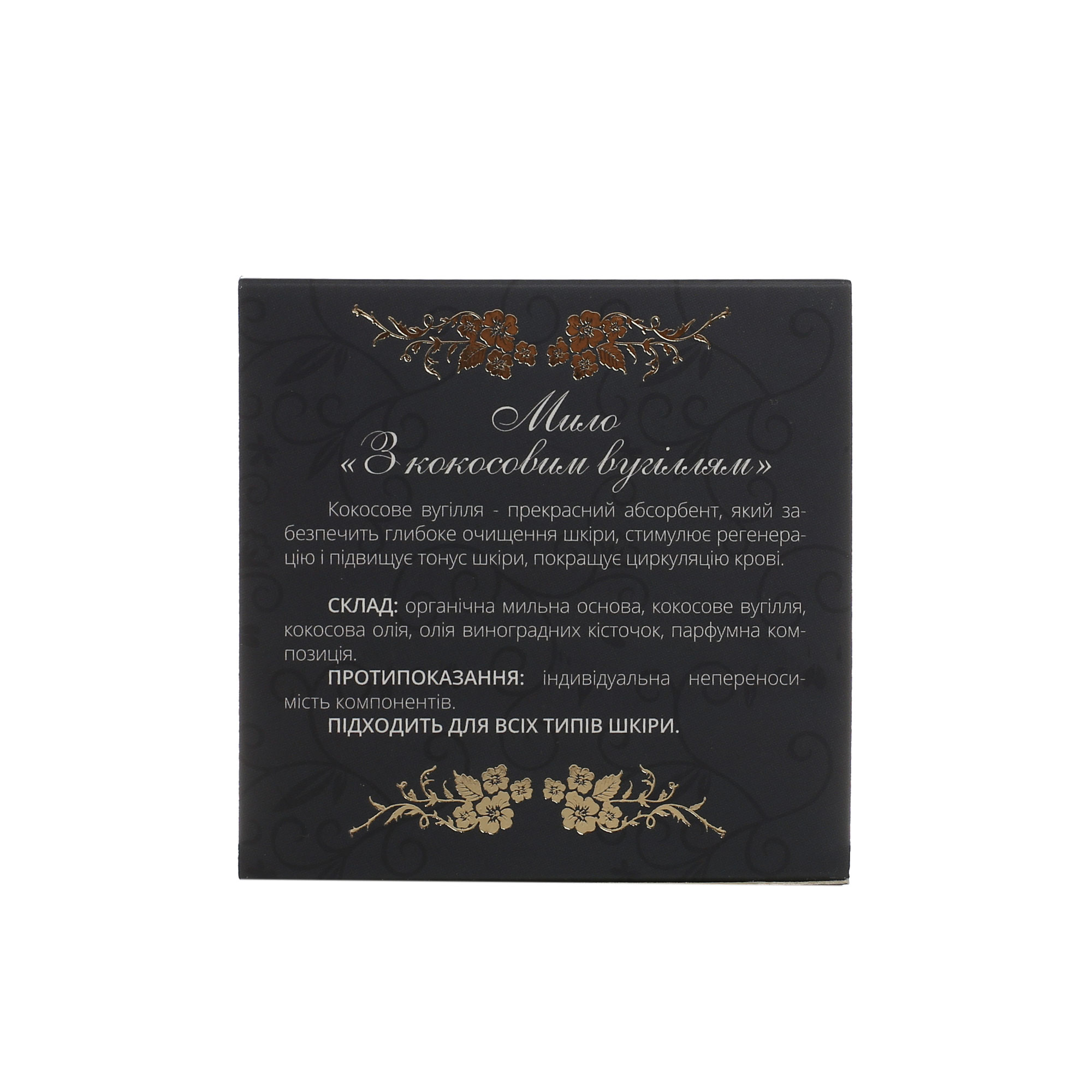 Склад: органічна мильна основа, кокосове вугілля, кокосова олія, олія виноградних кісточок, парфумна композиція.