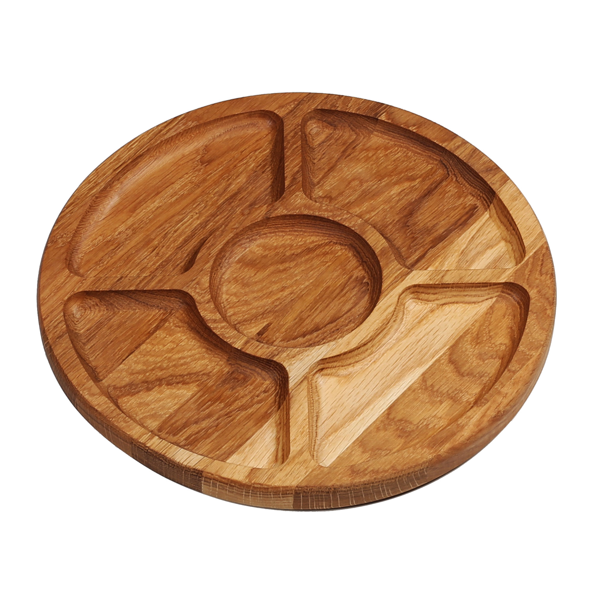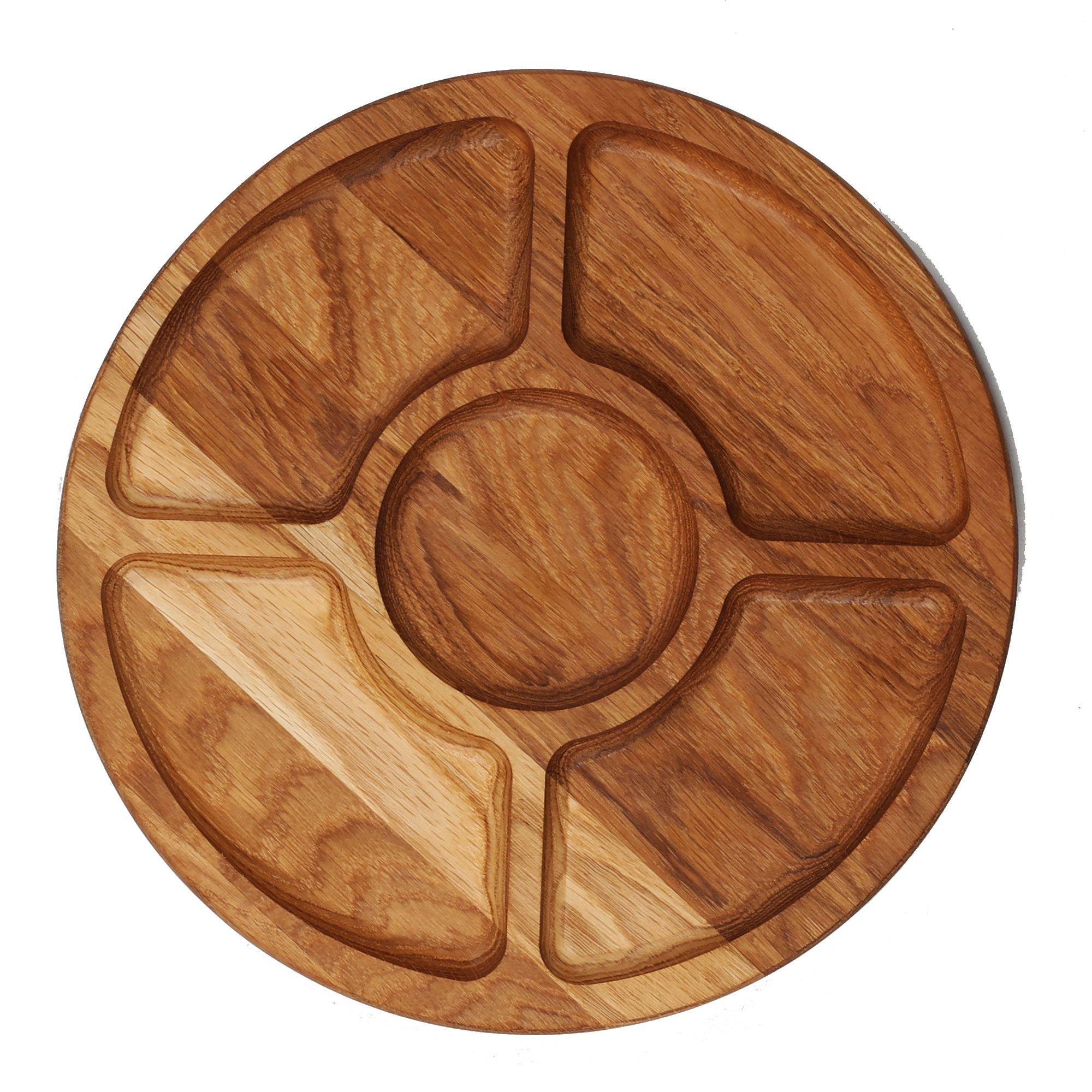 Дерев`яний двосторонній виріб. Одна сторона гладка і чудово підійде для піци, інша має 4 менших відділа в які можна покласти: фруктики, горішки і та інше